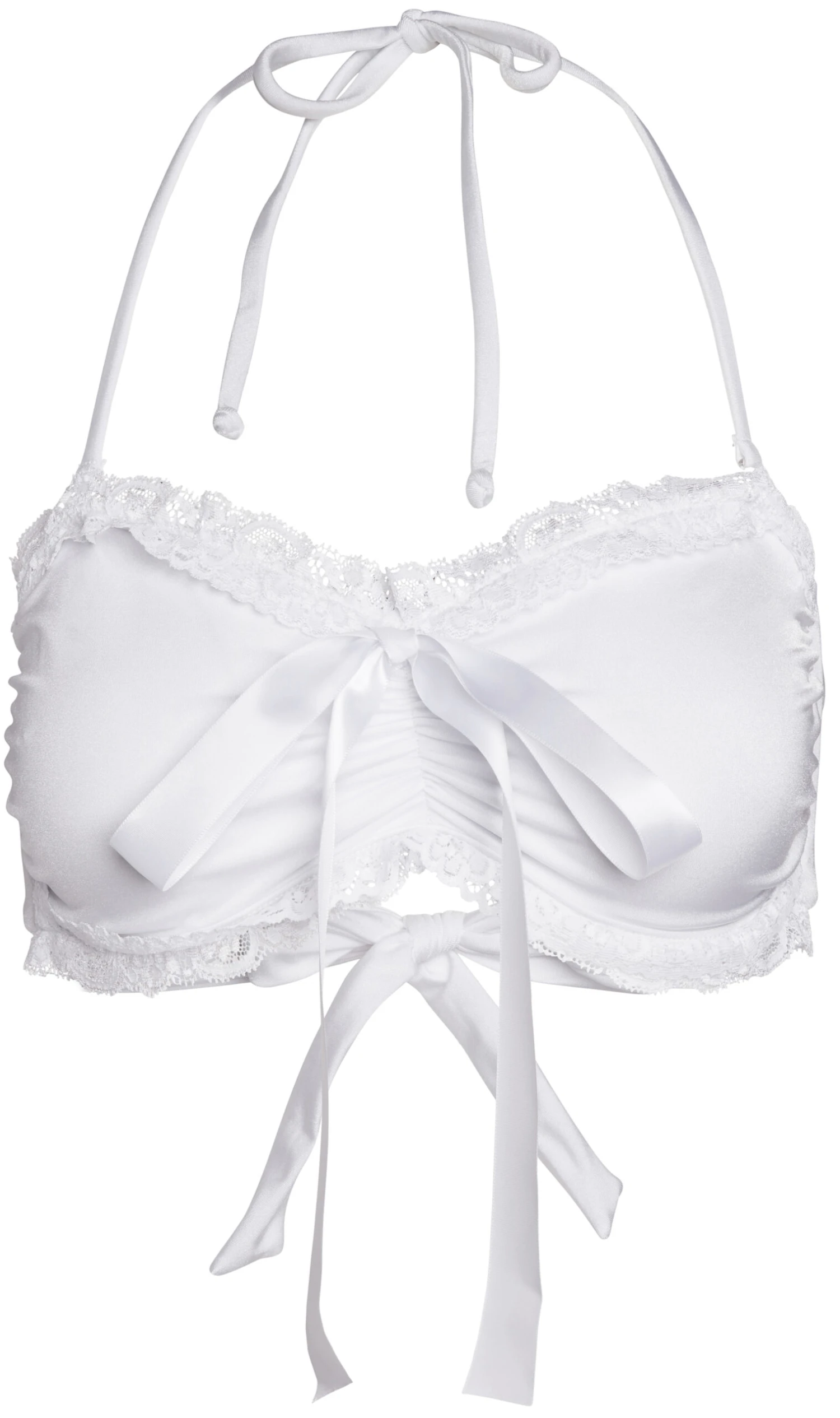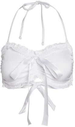 DETAILS: Made in the USA. Fully lined. White body, ruffled bridal lace trim and ribbon accents. Bandeau bikini top with wide back ties, bust pad pockets, and adjustable detachable skinny halter neck ties. CARE INSTRUCTIONS: Hand wash, line dry, no bleach, cool iron if necessary.