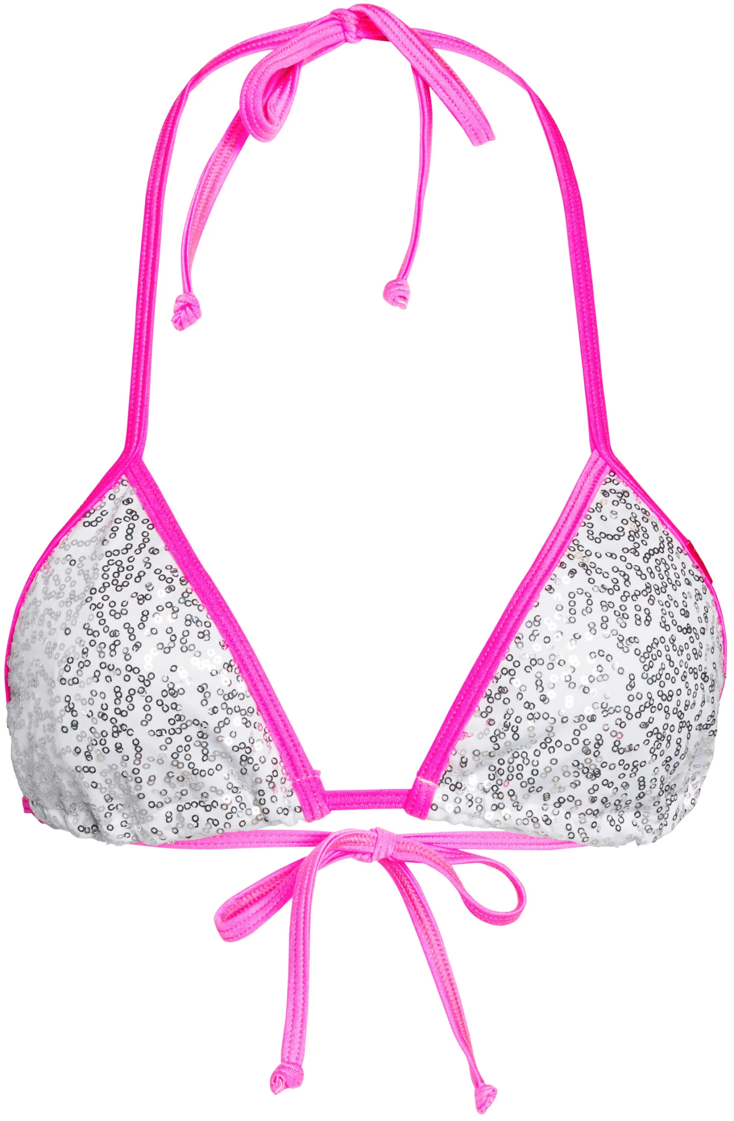 The ultimate party bikini top! This sequin bikini is perfect to wear at the resort, dayclub or even as a competition bikini! DETAILS: Made in the USA. Iridescent sequin body, fully lined. Adjustable triangle bikini top with skinny neck ties and bust pad pockets. Fully lined. CARE INSTRUCTIONS: Hand wash, line dry, no bleach, cool iron if necessary.