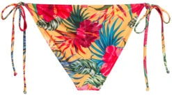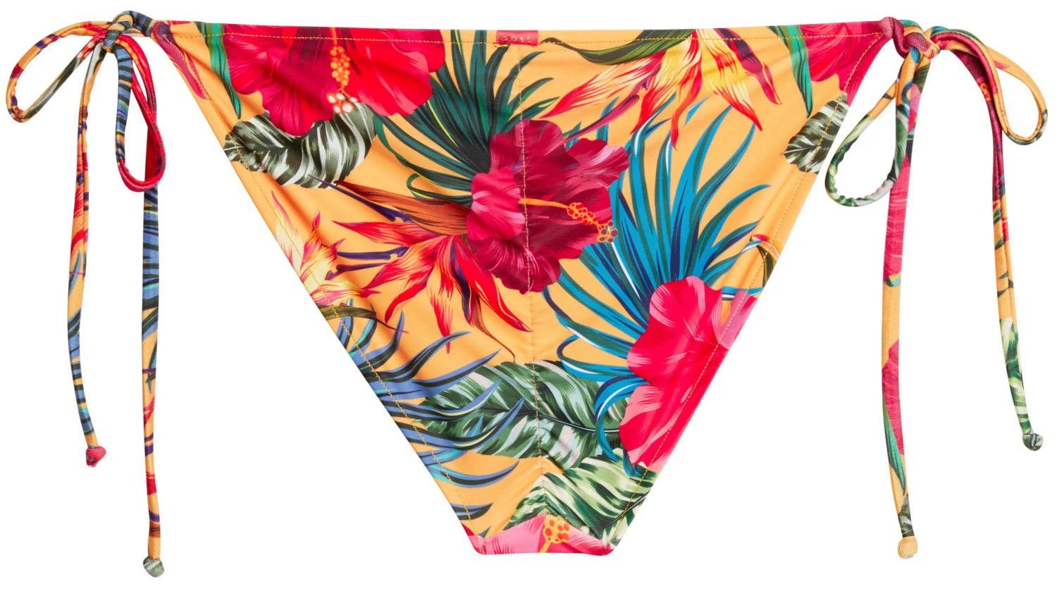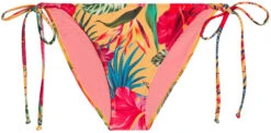 DETAILS: Made in the USA, fully lined. Sunset Tropical print, clean finish with no binding trim. Adjustable triangle string bikini top with skinny neck ties and bust pad pockets. CARE INSTRUCTIONS: Hand wash, line dry, no bleach, cool iron if necessary.